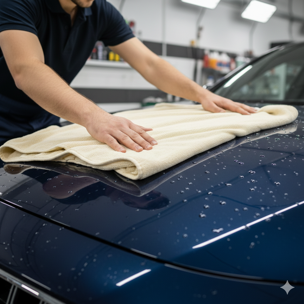 この油膜が残った状態で水滴を放置すると、油分が水滴を保持する土台となり、その中にミネラル分が濃縮されていきます。結果として、油とミネラルが混ざり合った「混成汚れ」となり、これは通常のカーシャンプーでも落ちない強固な被膜へと変化します。これが繰り返されることでボディは次第に「くすみ」を帯び、新車時の光沢は失われていきます。拭き上げという工程は、物理的に水分を除去すると同時に、水洗いで落ちきらなかった微細な汚れをクロスで絡め取る「最終清掃」の役割も果たしているのです。