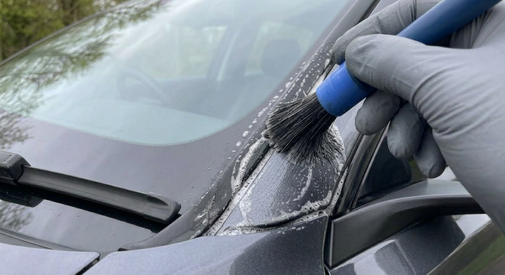 エンブレムの隙間、ドアミラーの根元、グリルの網目。こういった「細かい部分」に溜まった汚れを落とすのが「ディテールブラシ」です。