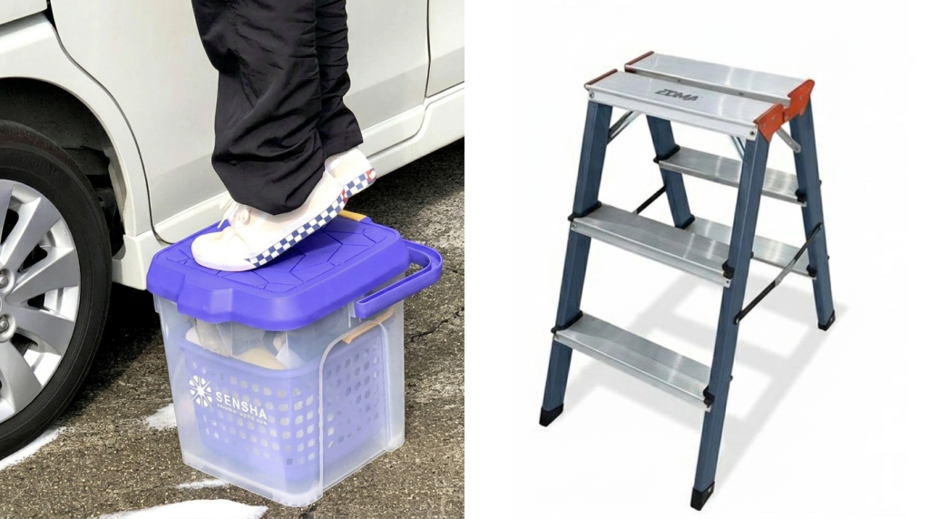 また、小さい車などで「脚立までは必要ない」という方には、「踏み台バケツ・踏み台ボックス」というのもあります。これなら中にアイテムを収納できますし、持ち運びもラクですからオススメです。ただ、底がプラスティックの物は重心の掛け方によっては滑ることもあるのでご注意!