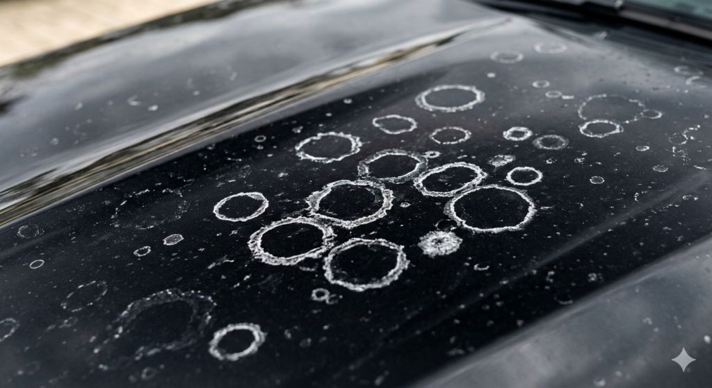 この時、水に含まれるカルシウムやマグネシウムなどのミネラル成分だけがボディに残り、白い環状のシミを作ります。これが「イオンデポジット」です。さらに放置すると、水分が塗装面に焼き付き、「ウォータースポット」と呼ばれる窪みを作ってしまいます。こうなると、通常の洗車では落とせず、研磨剤(コンパウンド)で塗装を削るしかありません。