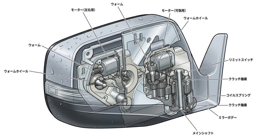 もしミラーを閉じ忘れた状態で洗車機が作動し、ブラシが接触してしまった場合、目に見える傷だけでなく「内部の致命的な破損」を覚悟しなければなりません。近年のドアミラーは、単なる鏡ではなく、電動格納用モーターウィンカーユニットヒーター、さらにはアラウンドビューモニター用のカメラやブラインドスポット検知センサーなど、高度な電子機器の塊です。